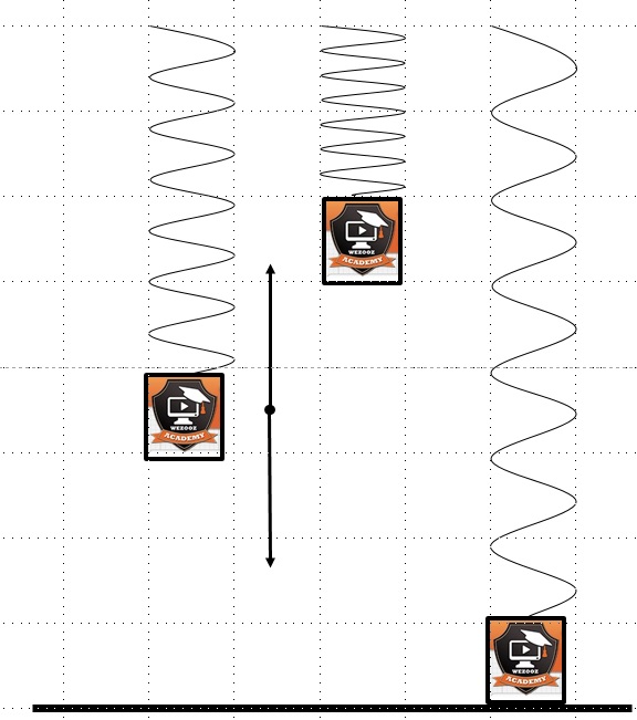 1. In onderstaande figuur zie je een massa aan een veer die op en neer trilt. We hebben ze getekend in 3 situaties. Eén keer ongeveer in het midden, één keer in zijn bovenste punt, en één keer in zijn onderste punt (hier raakt hij juist niet de grond, alvorens terug naar boven getrokken te worden). Welk van de 4 beschrijvingen geeft op een juiste wijze weer hoe het nu juist zit met de energie?